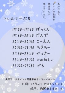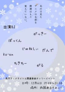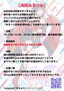 普段、居酒屋でやっているアニメソング飲みとかいうダサい名前の集まりの忘年会版です。